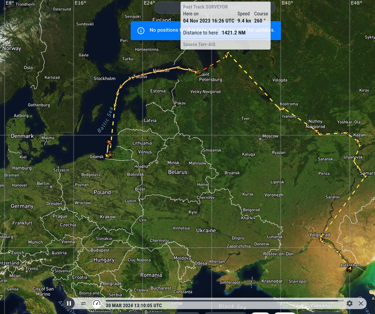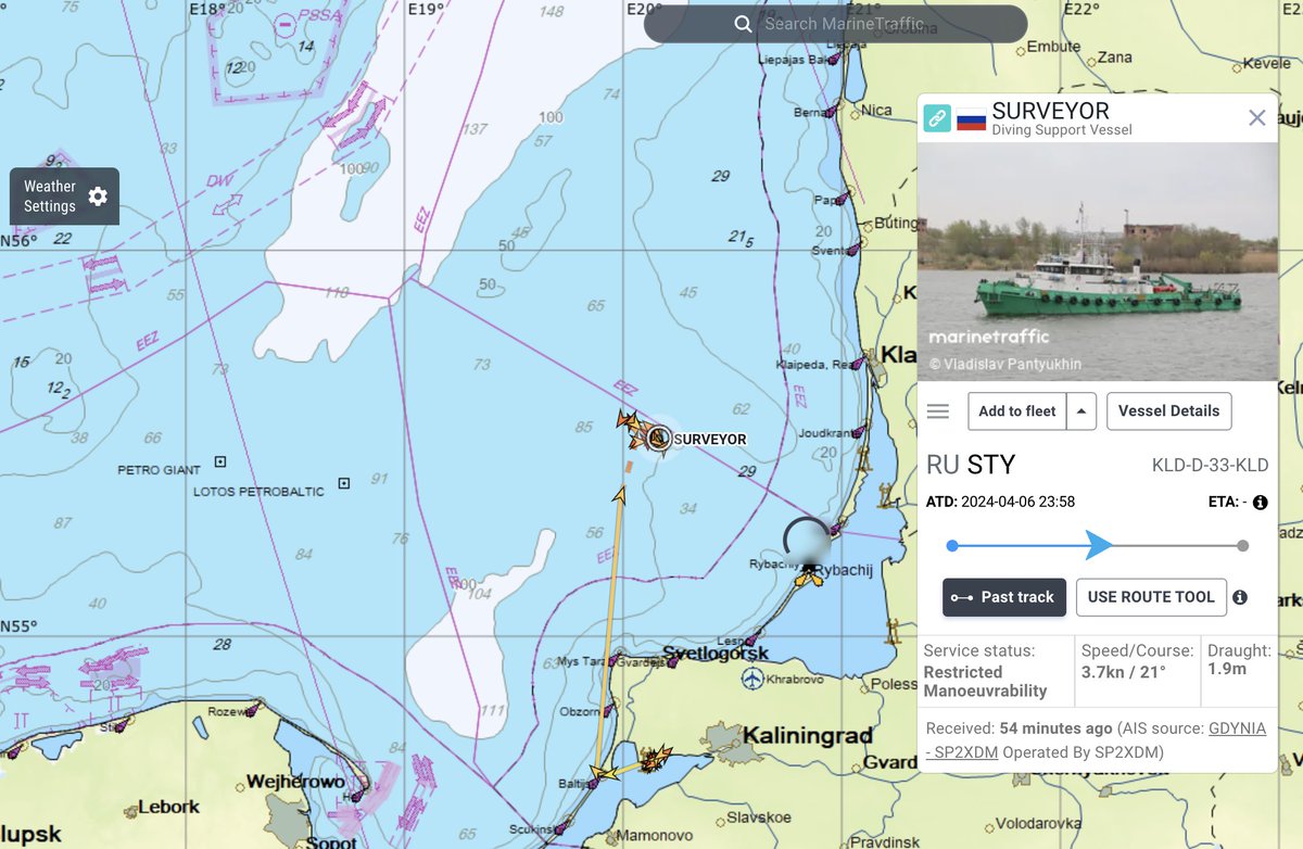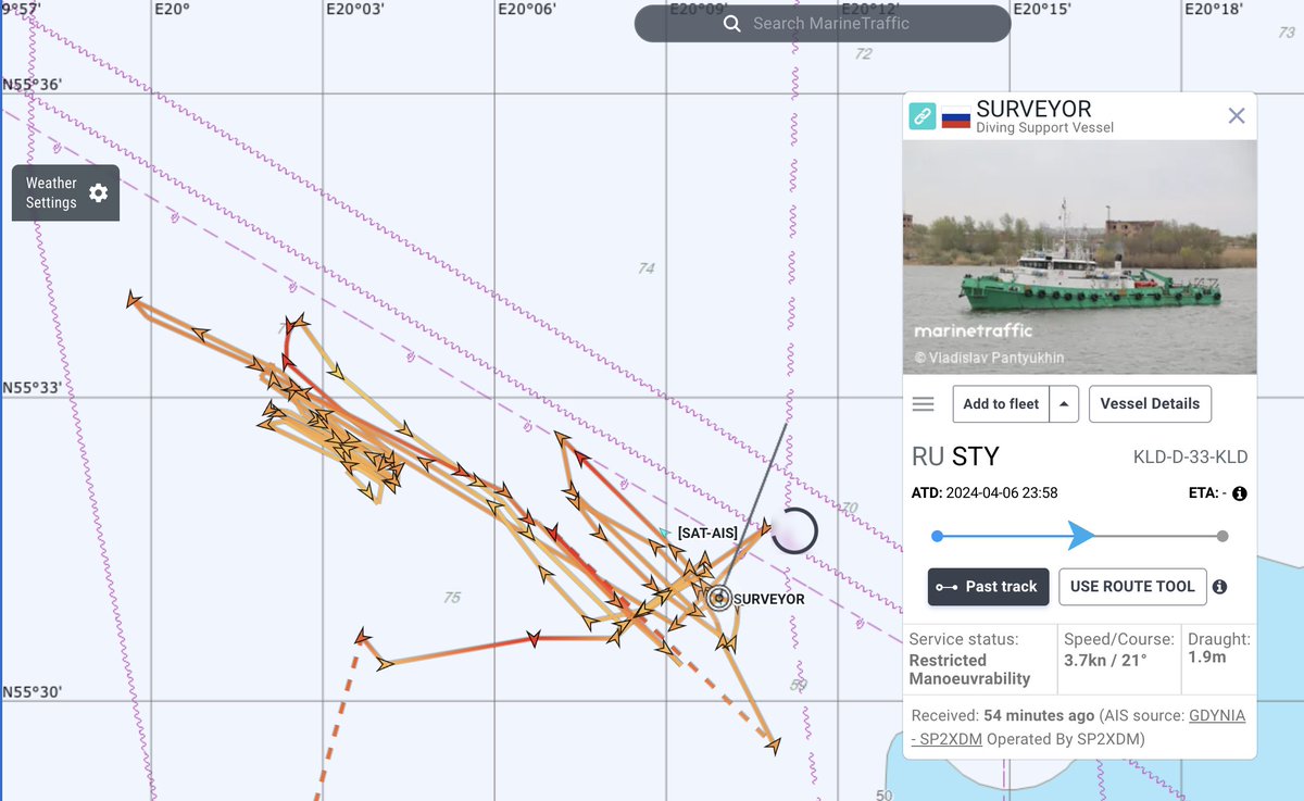 Since Sun morning dive support vessel 'Surveyor' is doing something along this cable by Kaliningrad.