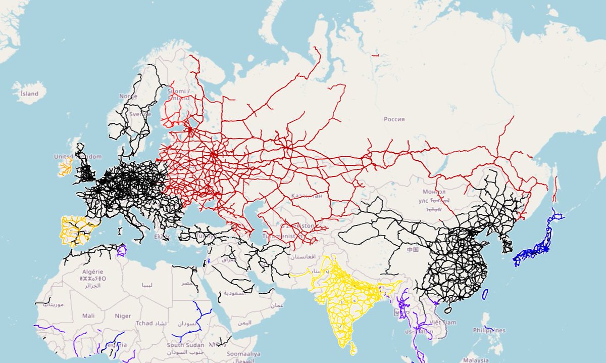 Voici la carte des écartements des voies de chemin de fer dans le monde. Pour la plupart, ils ne sont pas compatibles en eux ; il faut changer de train, ou d'essieux pour passer de l'un à l'autre.