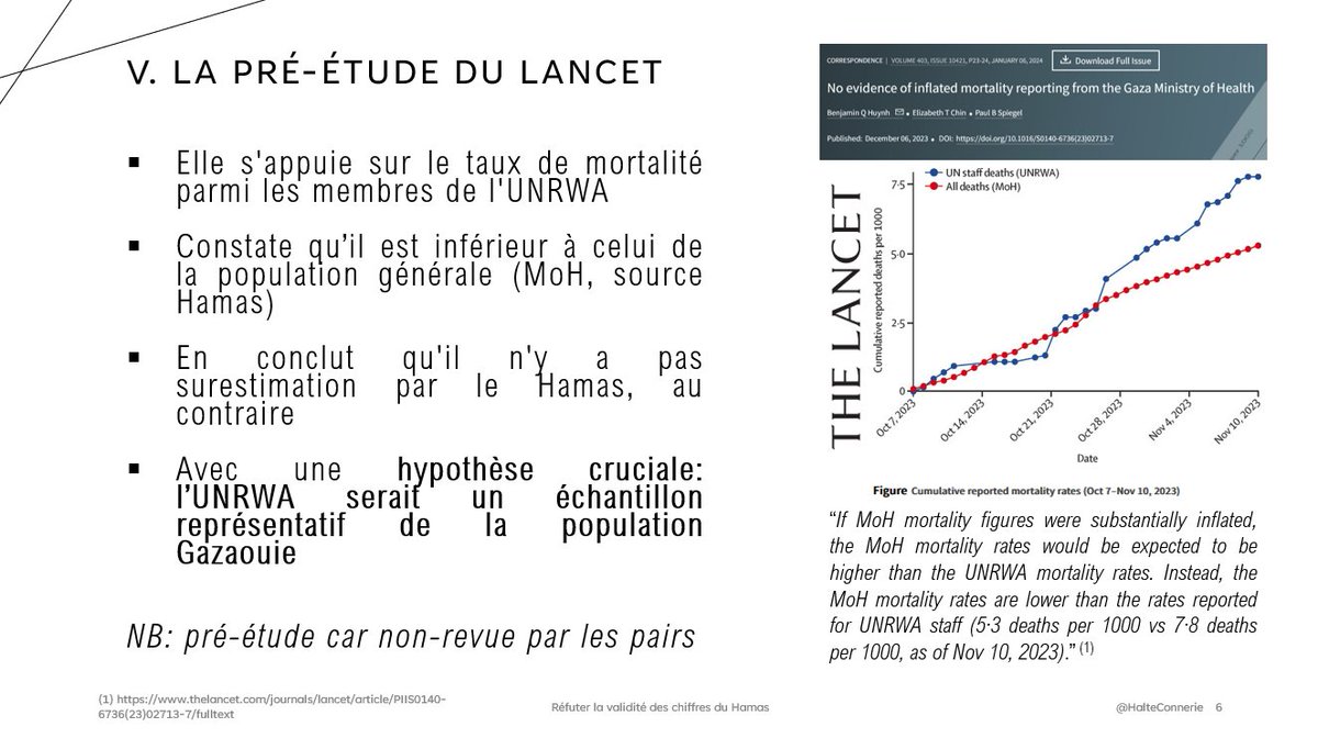 Passons maintenant au plat de résistance: l'étude du Lancet de décembre (en fait une pré-étude, non revue par les pairs). Que dit-elle ? Que l'analyse des décès à l'UNRWA ne permet pas de conclure à la surestimation, au contraire