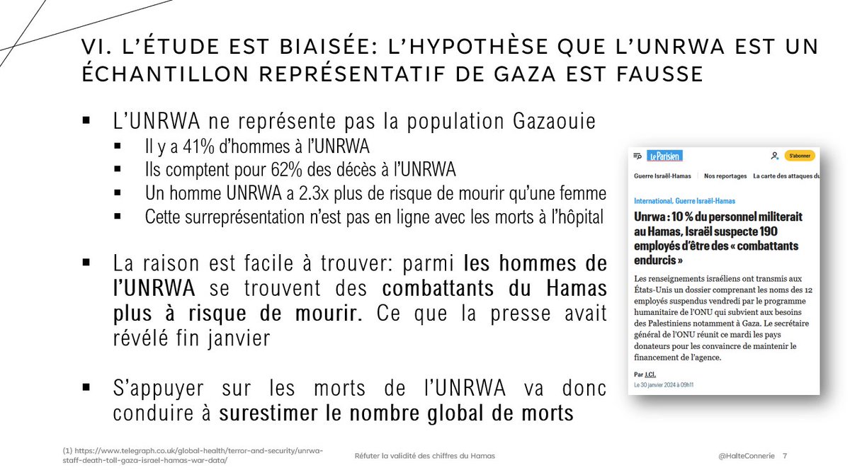 Problème: cette pré-étude du Lancet repose sur une hypothèse cruciale non-vérifiée: l'UNRWA n'est PAS un échantillon représentatif de la population gazaouie. Les chiffres montrent qu'il y a beaucoup d'hommes combattants à l'UNRWA (ce que la presse nous avait déjà indiqué)