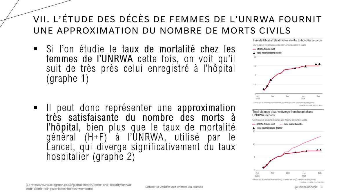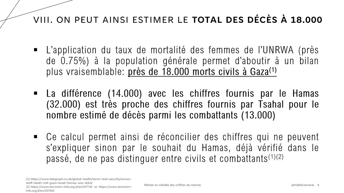 En appliquant le taux de mortalité des femmes de l'UNRWA on peut ainsi estimer le bilan global des morts à Gaza. Il y aurait 18.000 morts à Gaza au lieu des 32.000 du Hamas