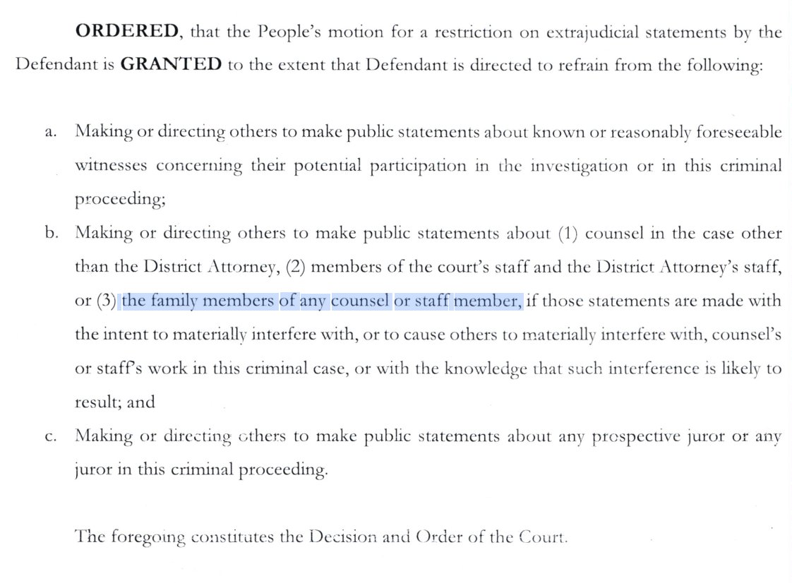 Bragg answers yes, and adds its also includes *his* family members, even though the gag order allows Trump to attack him personally.