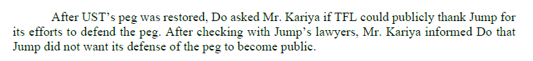 @SECGov @stablekwon 13/ But in external communications, such as this postmortem tweet thread, Terraform Labs didn’t mention Jump’s role in restoring the peg. Its messaging focused instead on UST’s algorithmic self-healing nature. Curran testified that Do told him not to mention Jump’s role