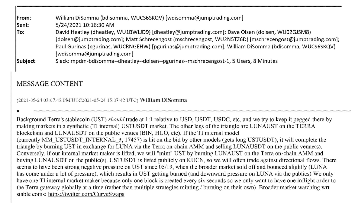 @SECGov @stablekwon 10/ On 5/24/2021, DiSomma briefed fellow execs from Jump Trading (not Jump Crypto) about efforts to restore the UST peg. Recipients included his fellow Jump co-founder and co-owner Paul Gurinas, Jump COO Matt Schrecengost, and Jump president Dave Olsen