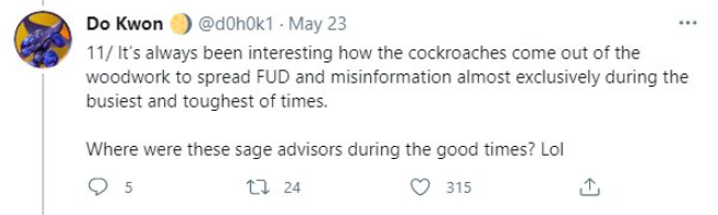 @SECGov @stablekwon 14/ Meanwhile Kwon took the opportunity to dunk on critics, as he often did on Twitter in those days.