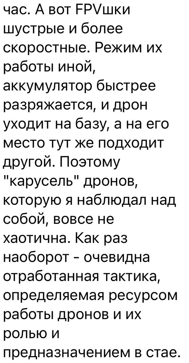3/ “It is not difficult to distinguish them from each other - “Baba Yaga” is massive and FPVs are nimble and faster. Their mode of operation is different, their battery discharges faster, and if the drone returns to base, another FPV immediately takes its place.”