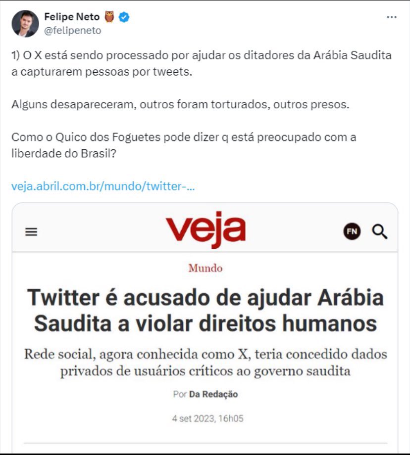 Também é interessante que ele fale tanto da importância de combater fake news, sendo que ele toda hora publica uma nova. Essa semana mesmo ele compartilhou que o Twitter foi acusado de ajudar a Arábia Saudita a violar direitos humanos, querendo atribuir isso a Elon Musk, mas isso aconteceu muito antes de Musk comprar a rede social. Ele apagou o tweet depois, mas o print é eterno.
