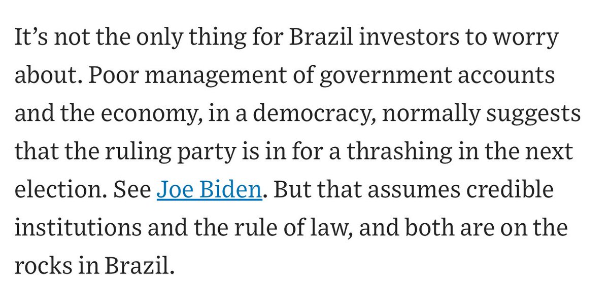 Aqui ela fala que, normalmente, uma administração ruim da economia significa perda das próximas eleições, vide Joe Biden, mas que, para isso, é necessário instituições confiáveis e Estado de direito, e “ambos estão em risco no Brasil”.
