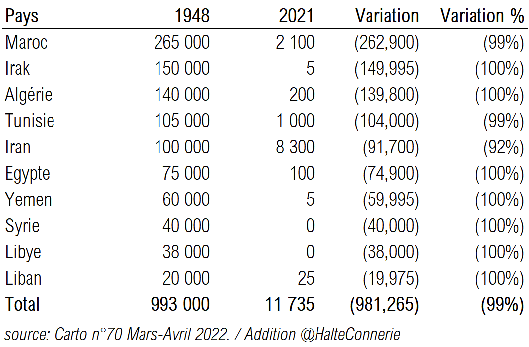 Un récapitulatif de ces chiffres montre que la population Juive en terre arabo-musulmane a été divisée par 85, passant de 993.000 à 11.735 individus.