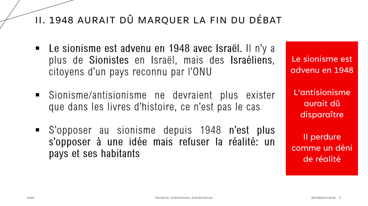 Le sionisme étant advenu par la création de l'état d'Israël en 1948, on ne devrait plus employer ce terme que dans un cadre 𝗵𝗶𝘀𝘁𝗼𝗿𝗶𝗾𝘂𝗲. Avant 1948, l'antisionisme n'était qu'une idée. Depuis 1948, c'est un déni de réalité, mais certains s'y accrochent...