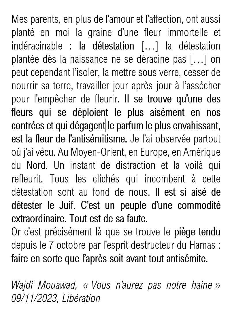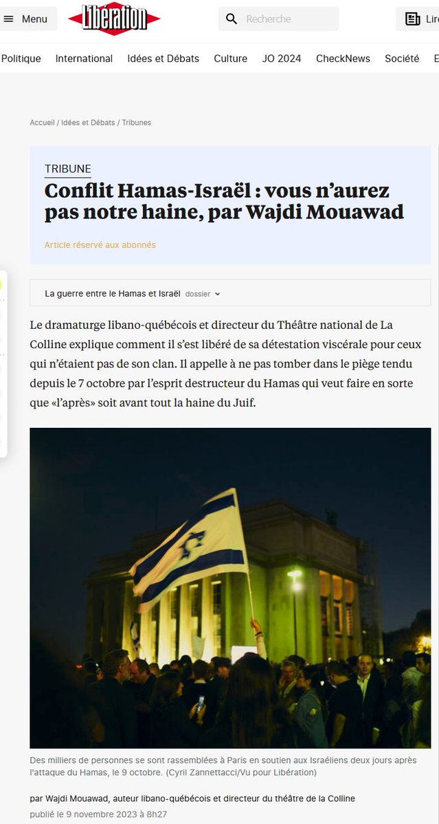 Ce dramaturge avait écrit une belle tribune dans Libé le 9/11 "Vous n'aurez pas notre haine" appelant à la vigilance dans la lutte contre l'antisémitisme post 7/10