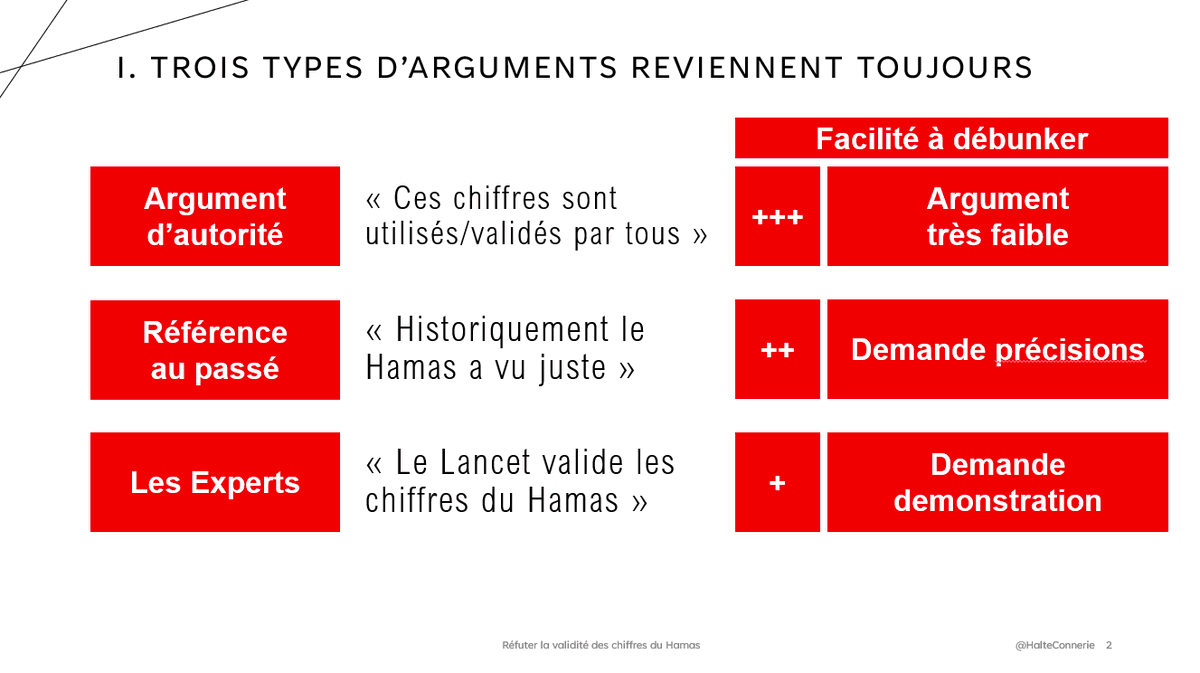 Pour essayer de valider les chiffres du Hamas, les propagandistes utilisent trois types d'arguments, toujours les mêmes, dans l'ordre décroissant de facilité de réfutation