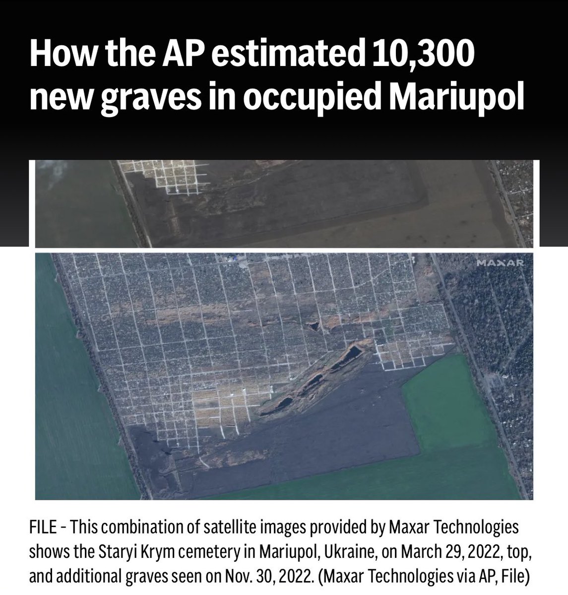 4/23 In Mariupol alone, satellite images show what’s estimated to be 10000 graves, that has yet to be examined & counted for. As we’ve seen in other places like Izium & Bucha, many of these graves likely contains way more than one body as russia has a way of making mass graves.