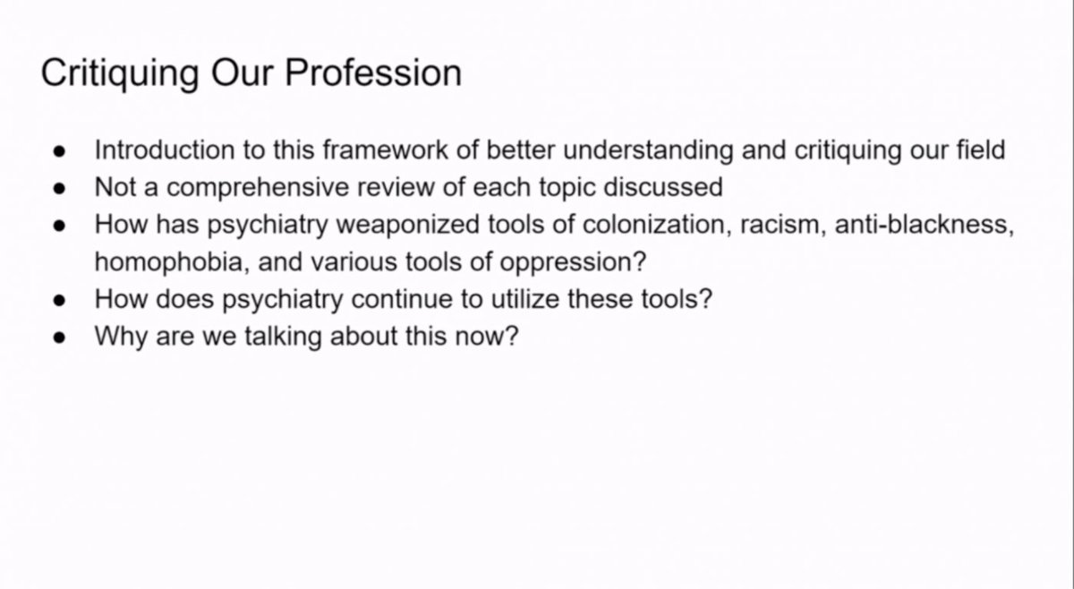 Such jargon was peppered throughout Izar and Moustafa’s talk. One slide asserted that psychiatry has "weaponized tools of colonization, racism, anti-blackness, homophobia, and various tools of oppressions."
