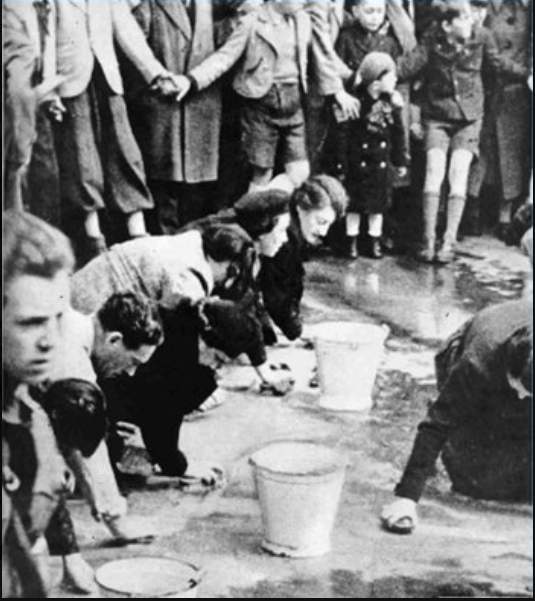 Stavo passeggiando per la città quando vidi alcuni soldati tedeschi che si stavano divertendo obbligando alcuni ebrei a pulire con delle spazzole il suolo calpestato dai loro sacri "piedi ariani".