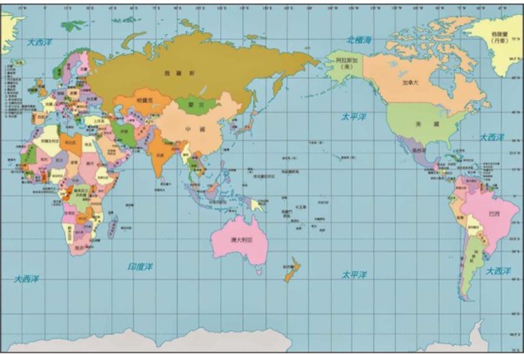Já se estivéssemos no província chinesa de Taiwan, o mapa-mundi encontrado na sala de aula seria este.