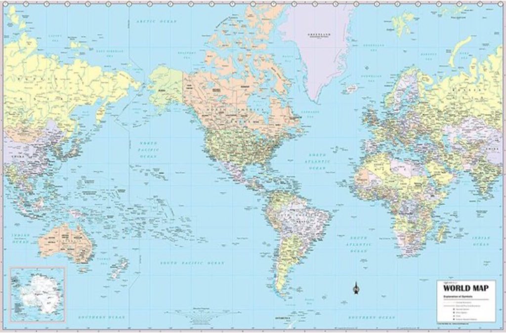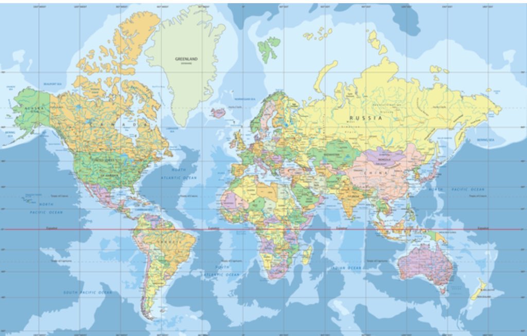 O resultado da Mercator é que ela preserva tudo que está próximo ao Equador (ex: Brasil, África) e aumenta o que está no Norte enormemente (Canadá, EUA, Rússia, Europa…) e um pouco do que está no extremo sul.
