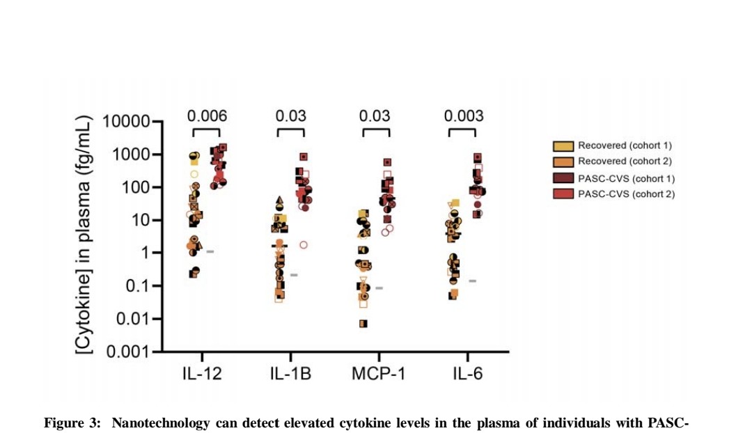 Nanotechnology (immunostorm chip) detected significantly elevated trace levels of IL-12, IL-1ฮฒ, MCP-1 and IL-6 in PASC-CVS plasma compared to Recovered donors.