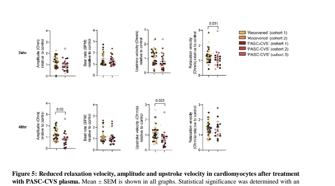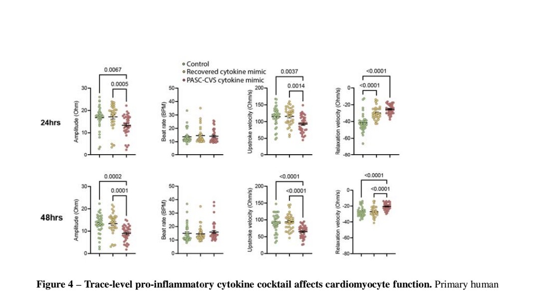 5) A cytokine cocktail mimicking PASC-CVS levels impaired cardiomyocyte function in vitro, reducing amplitude and upstroke velocity. PASC-CVS plasma also reduced cardiomyocyte relaxation velocity.