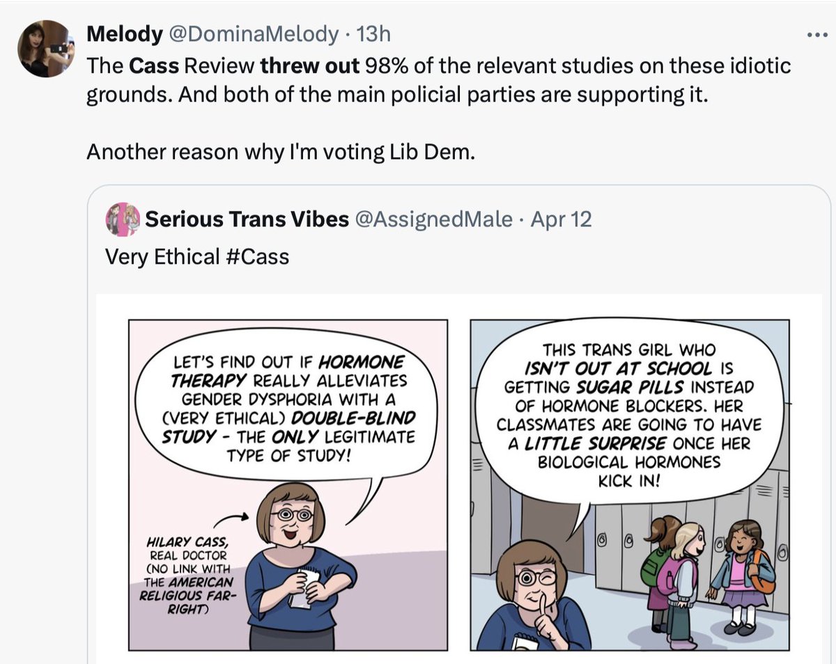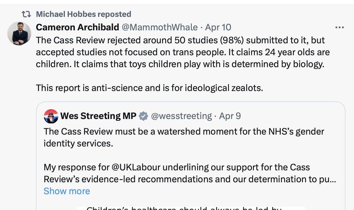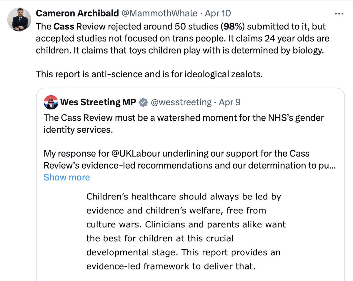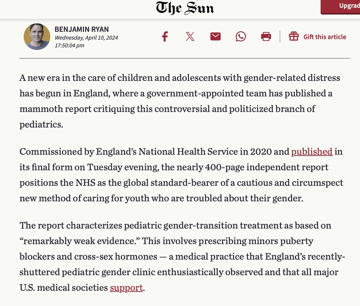 @billybragg I know Caraballo did not have access to the Cass Review’s final report before the embargo lifted (at 7:01pm ET April 9), because shortly before the embargo was set to lift, she tweeted what she thought was the Cass report. But the link was to the review papers, not the report.