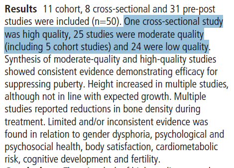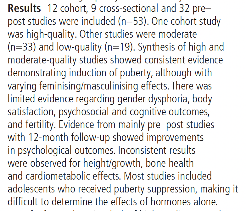The other systematic lit review examined cross-sex hormone use for gender distress in minors. It examined 53 studies, and included in its synthesis one high-quality study and 33 moderate-quality studies. But it did no simply ignore the 19 low-quality ones.