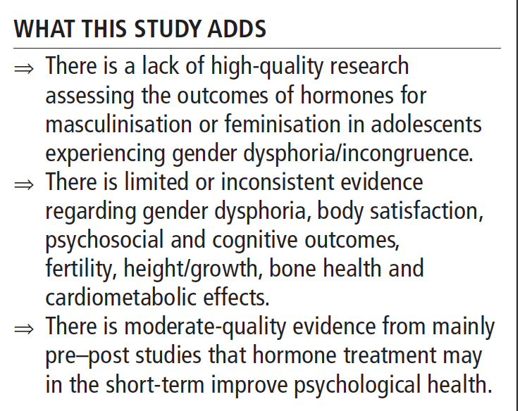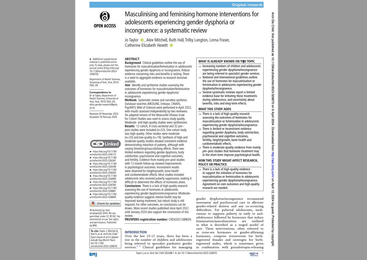 What this paper does is break down what the 53 papers about hormones find and then try to make sense of what all this can tell us. Importantly, it points to key areas where the research is particularly uncertain--pointing to where more research is needed. adc.bmj.com/content/archdi…