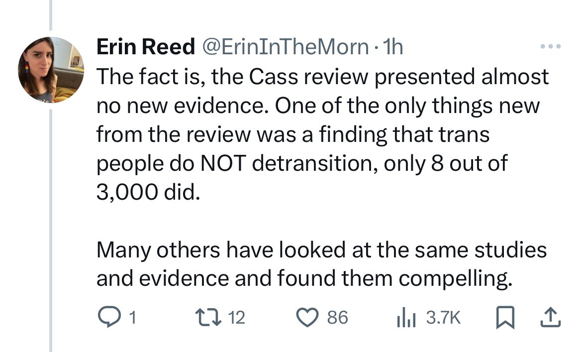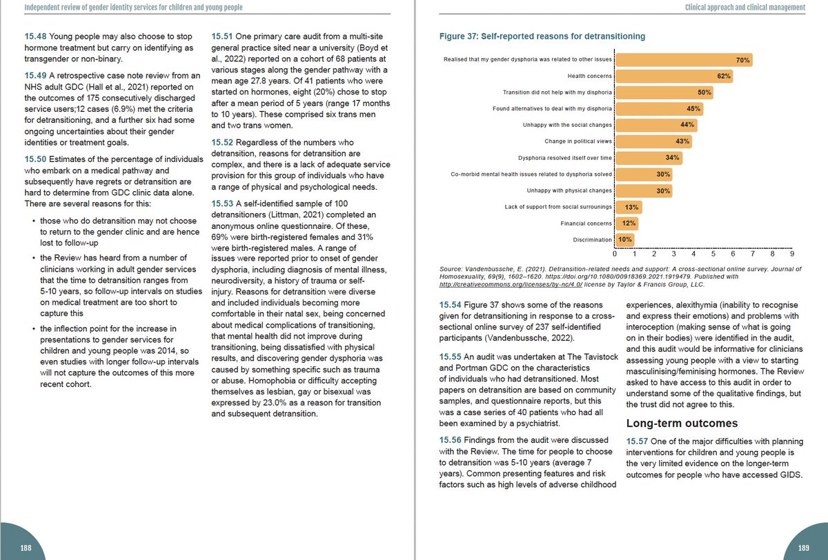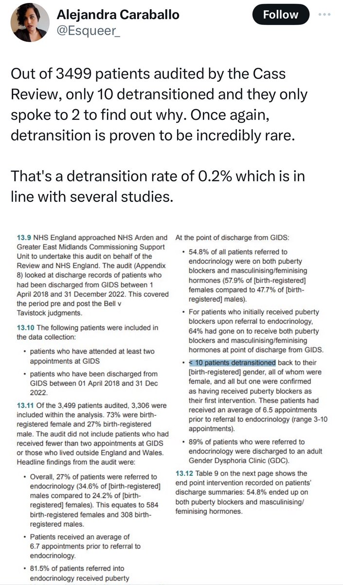 @billybragg @JuliaSerano Jones also repeatedly says that the detransition rate is about 1%, saying that long-term studies show this. This despite the fact that Cass said in her report that because of a lack of long-term follow-up, the detransition rate is unknown.