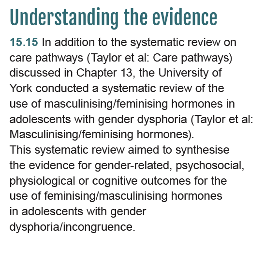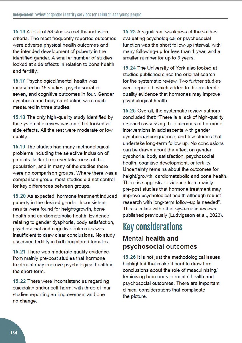 On p. 184 of the Cass Review, she goes into considerable detail about the findings of the systematic literature review about cross-sex hormones.