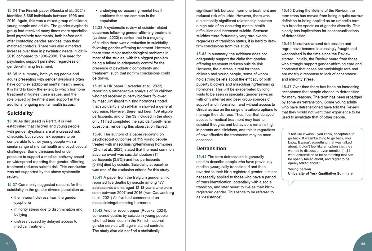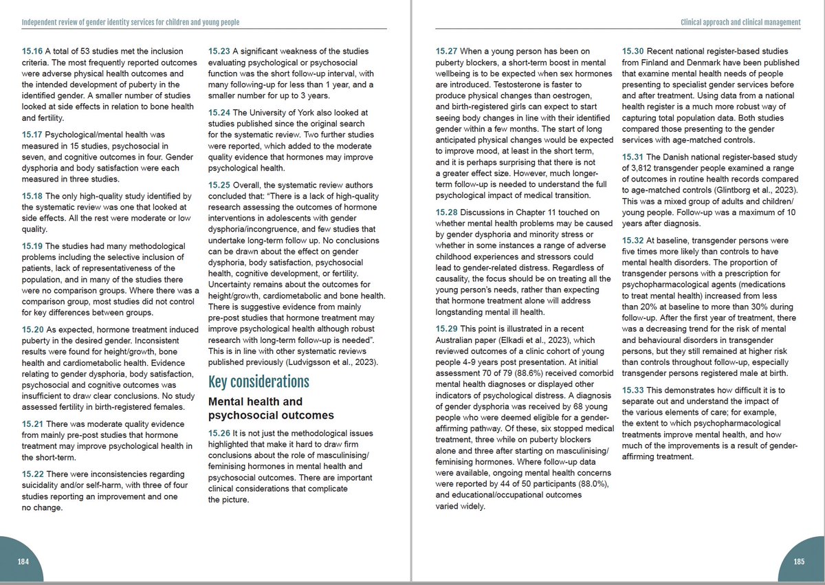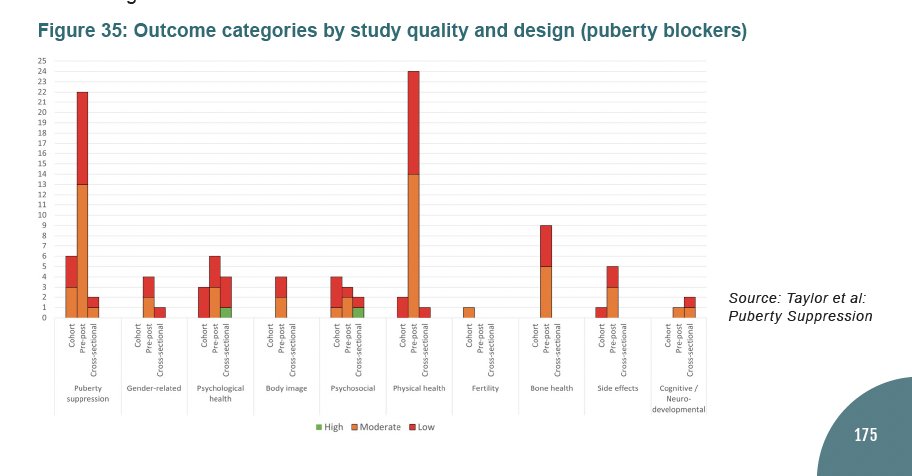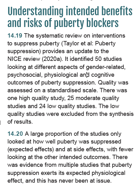 The Cass Review also folds in the findings from the systematic literature review about puberty blockers for gender distressed minors (p 175). This review examined 50 studies, including one high-quality and 25 moderate-quality studies. cass.independent-review.uk/wp-content/upl…