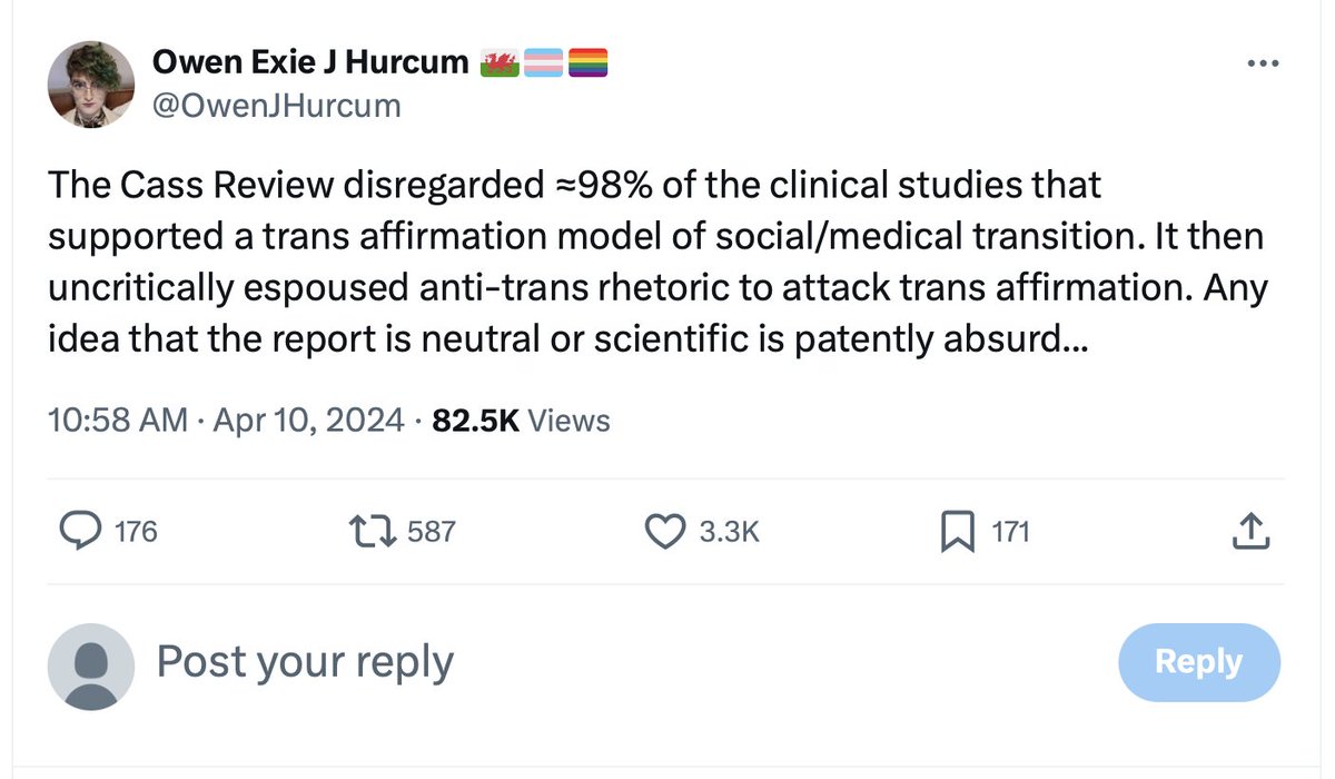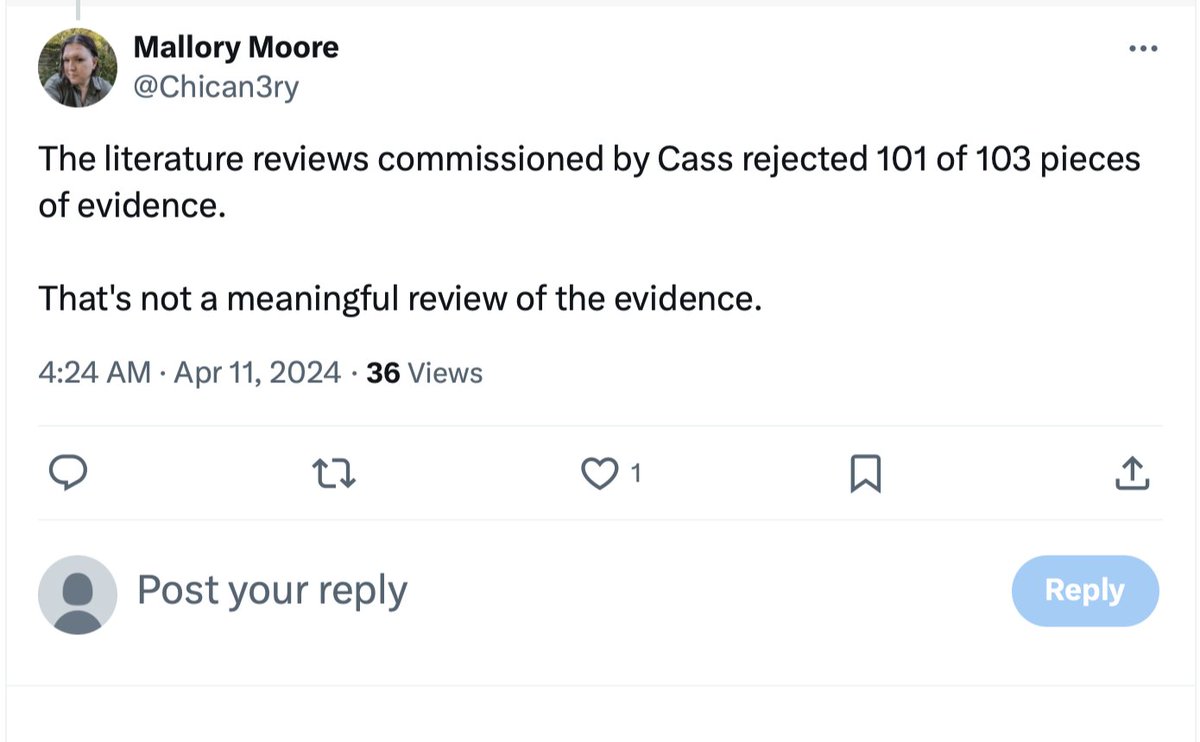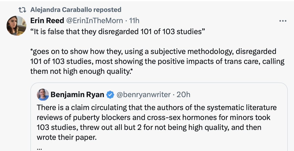 Among the X accounts to falsely claim that the Cass Review and 2 of the systematic lit reviews on which it was based simply discarded 101 of 103 studies on pediatric gender-transition treatment: