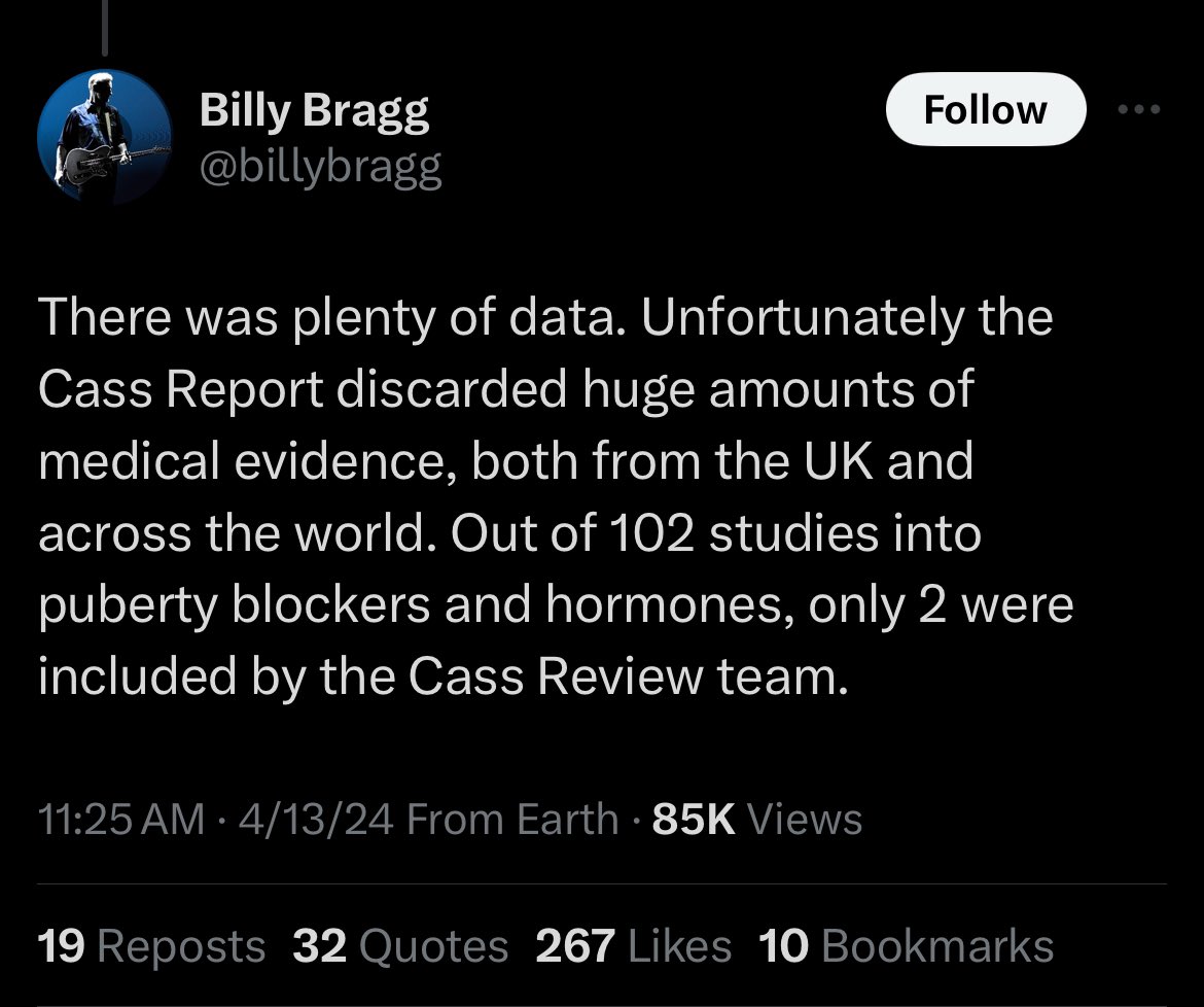 English singer @BillyBragg is also among those repeating the incorrect claim that the Cass Review simply discarded over 100 studies on gender-transition treatment for children and only inclined two such studies in the final report.