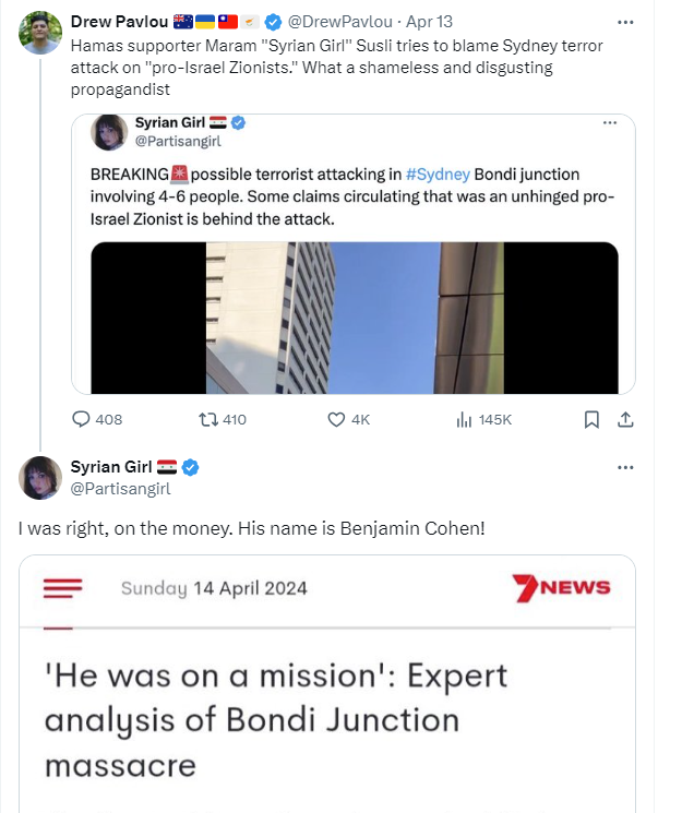 11/ intifada' comment. Similarly, there were attempts to claim the attacker was a pro-Israel Zionist by accounts who famously are pro-Assad and pro Russia - such as Maram Susli. This was likely a reflexive accusation designed to diffuse the inevitable political cost