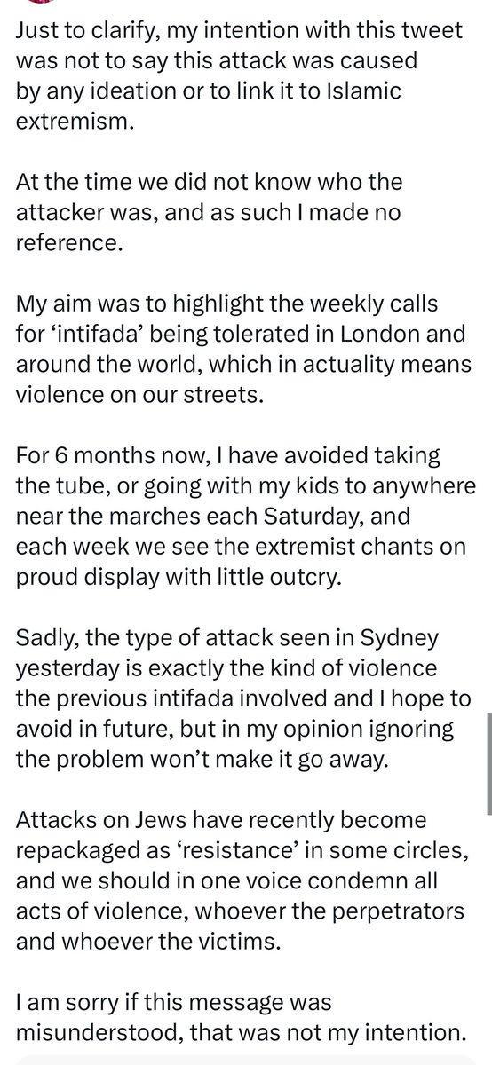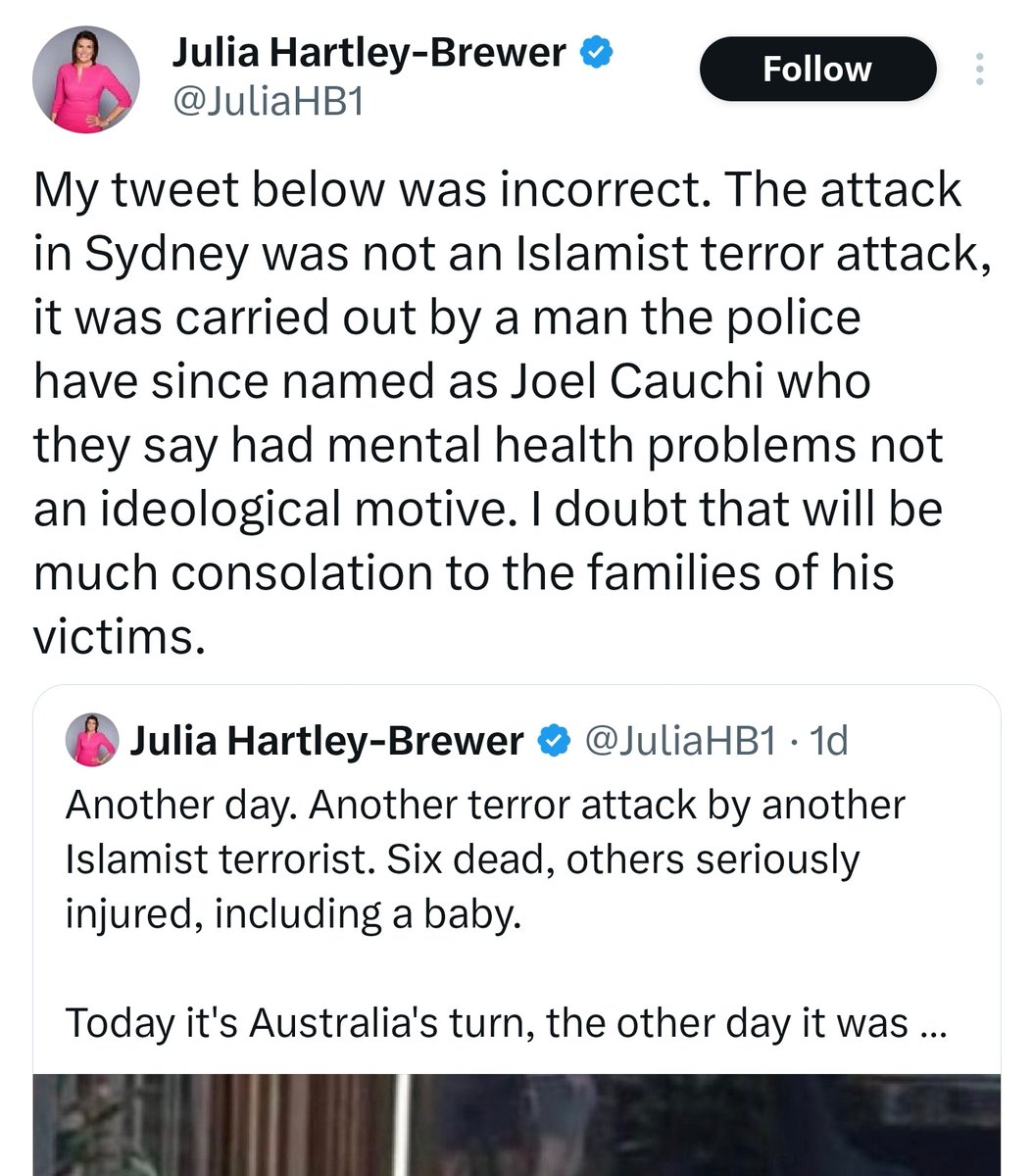 10/ So it's pretty clear what happened here. There was a tragic attack in Sydney. The familiar accusations that the perpetrator was Muslim circulated initially. The war in Gaza also prompted some to instrumentalise it to make propaganda points - eg Rachel Riley's 'global