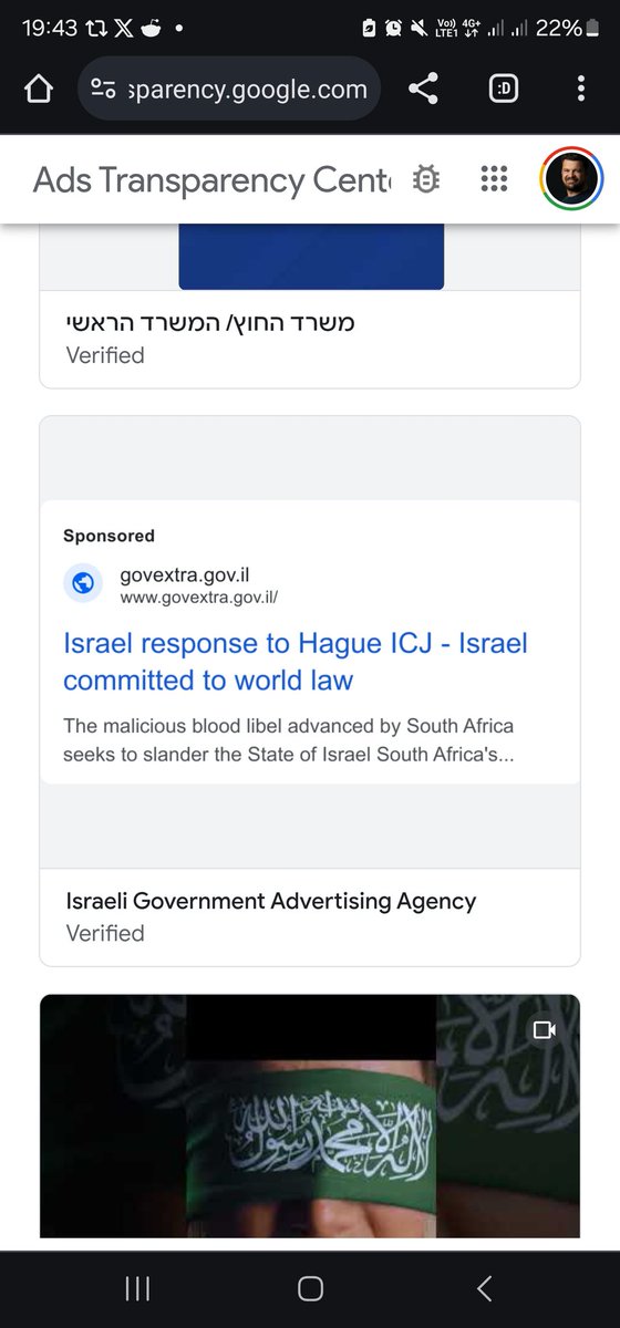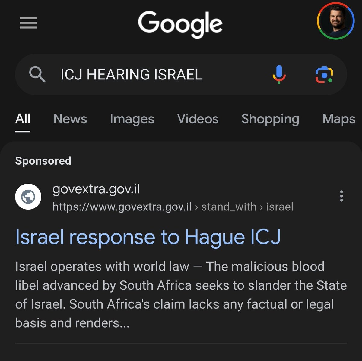 Google "ICJ HEARING" and "Israel" you'll see the Israeli government have paid Google for another ad putting their propaganda at the top of the search engine. They've done this numerous times, including when Amnesty International called Israel an Apartheid State