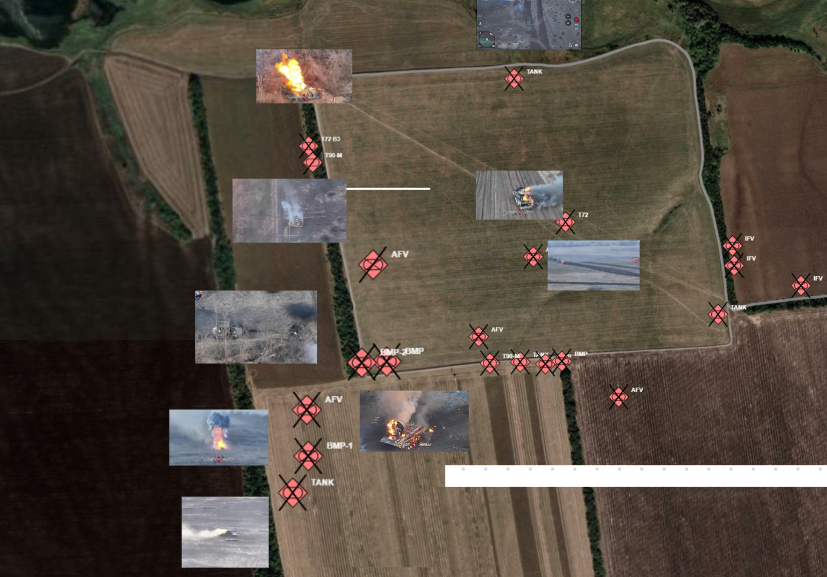 Plusieurs comptes en partagent. Deepstate a fait une analyse, point rouge = Russe (confirmé grâce aux vidéos au sol), point bleu, pertes Ukrainiennes.
