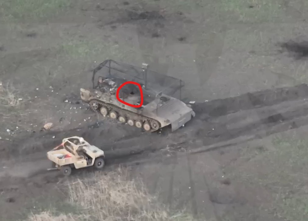 Le premier BMP est frappé par un drone FPV, le soldat qui s'y cache est forcément tué. Il est en feu: donc détruit et ne sera plus jamais utilisable (détonation des munitions à l'intérieur, on est passé d'un véhicule abandonné à détruit.