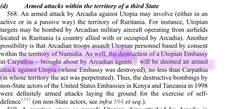 Der Iran beruft sich daher auf das Selbstverteidigungsrecht. Das kann (!) bei Botschaften greifen (siehe Yoram Dinstein dazu), muss aber nicht. Botschaften ≠ Staatsgebiet des Landes der Botschaft (Mythos)