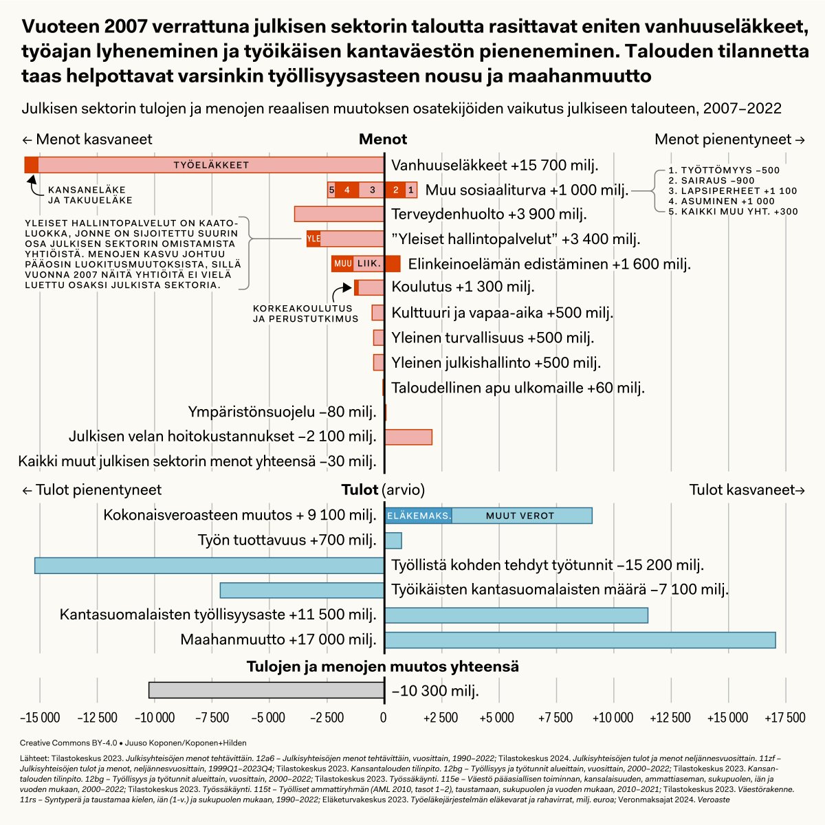 @petterilindholm @MuhonenTeemu Kuvio kuvaa siis tulojen ja menojen muutosta 2007–2022. Pylväät osoittavat vastakkaisiin suuntiin siten, että vasemmalle osoittavat pylväät merkitsevät tilanteen huonontumista (menojen kasvua tai tulojen pienenmistä) ja oikealle osoittavat sen paranemista. 6/22