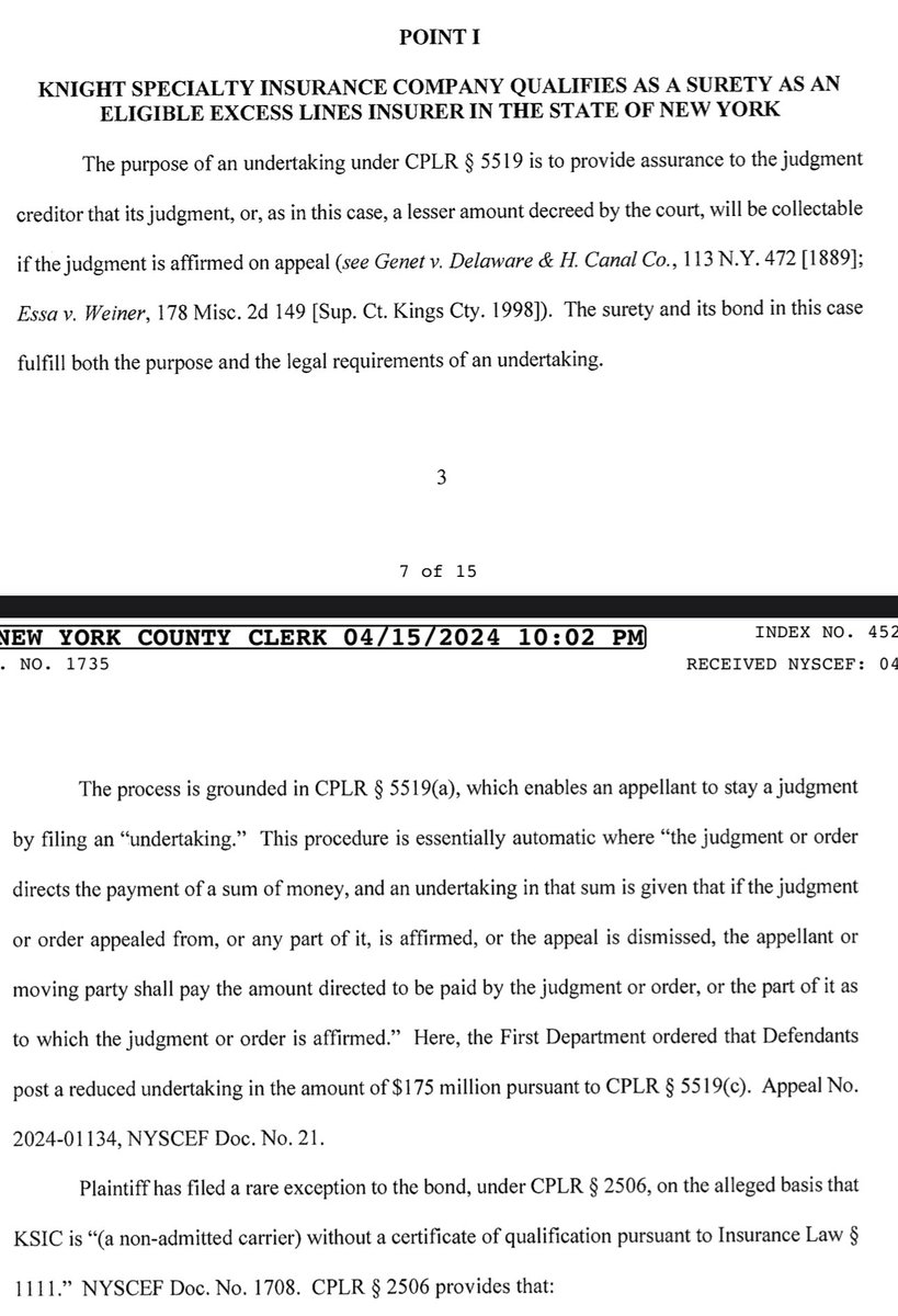 I’m no expert, but I think to back a bond, the guarantor has to have at least enough cash to cover it. But here, they say trump is covering it and they have access to Trump’s Schwab account 3/