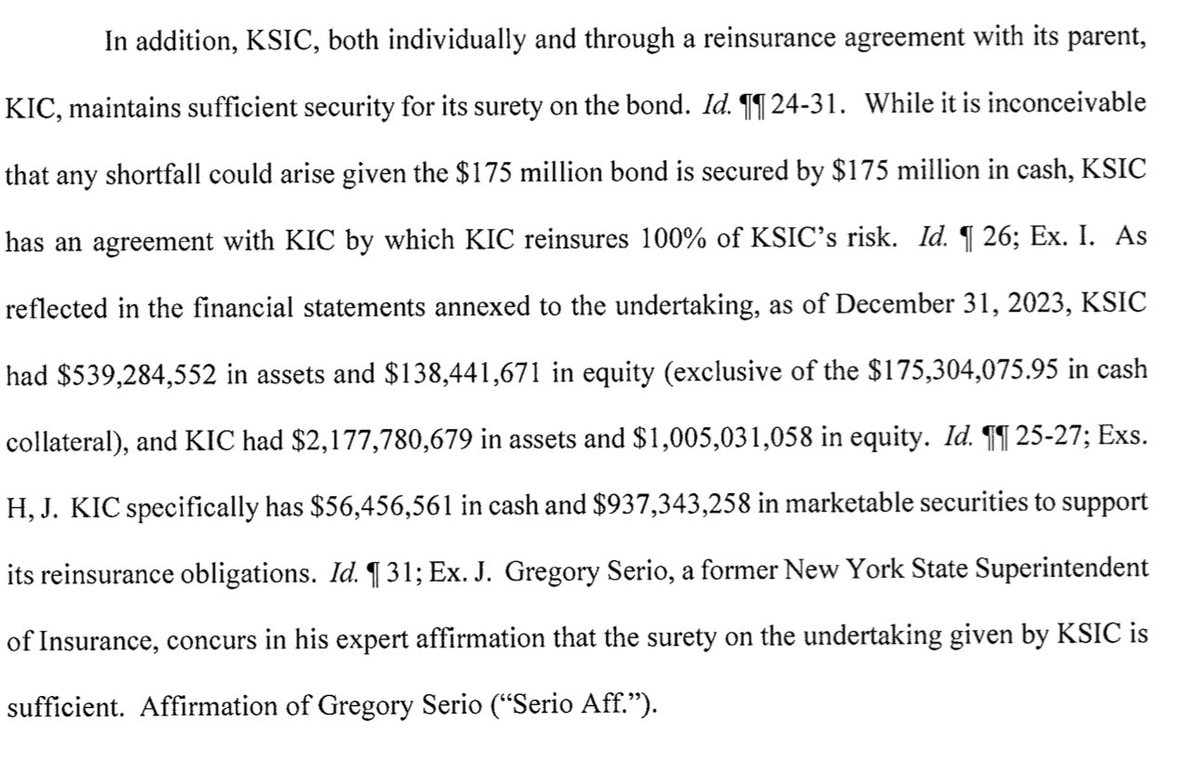 I suppose they only have to guarantee the bond amount of $175M, but doing it through reinsurance from the parent company seems weird to me. Not to mention the trump Schwab account. Is this different than the Schwab account he used to have Chubb back his E Jean Carroll bond? 5/