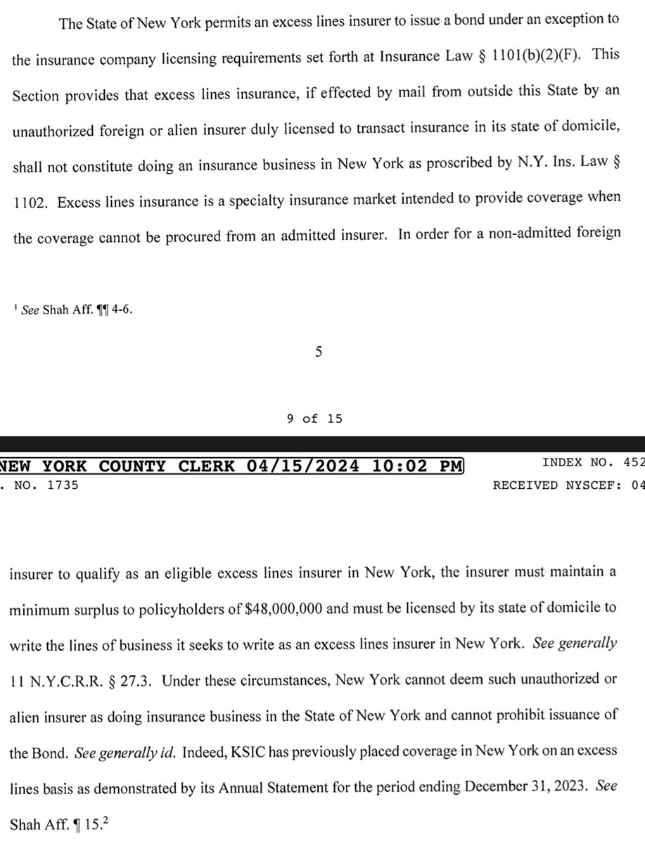I mean, just read this justification for excess line insurers to back the bond. “excess lines insurance, if effected by mail from outside this State by an unauthorized foreign or alien insurer duly licensed to transact insurance in its state of domicile, shall not constitute doing an insurance business in New York.” 7/