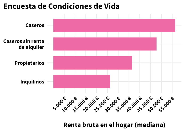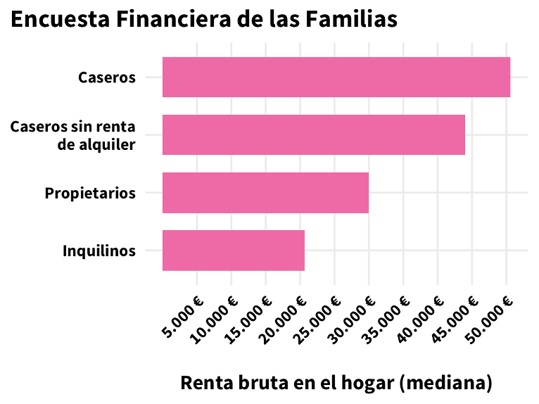 En este gráfico se observa cómo los hogares de caseros se concentran en las rentas más altas, y los inquilinos en las más bajas.