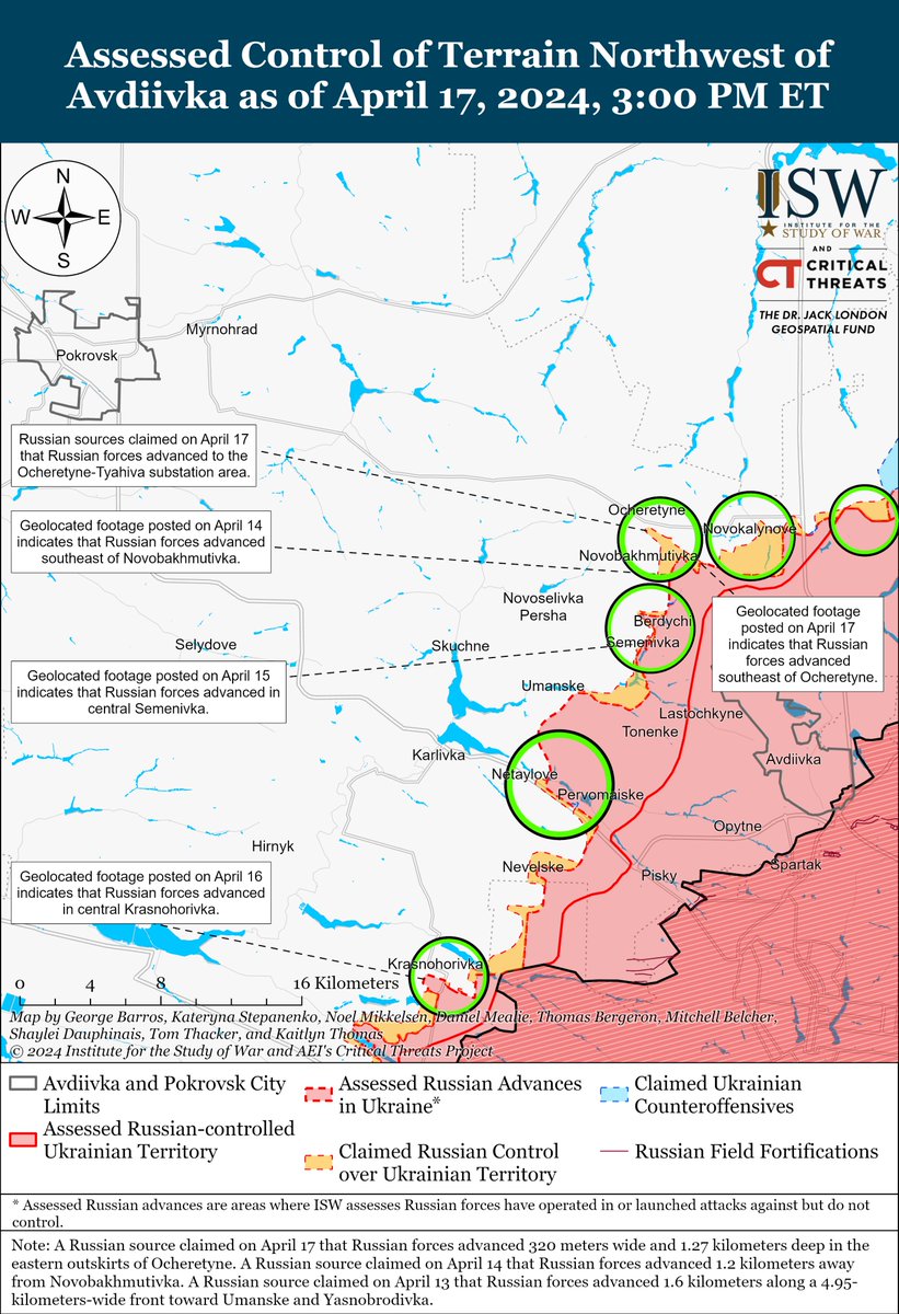 2/ Geolocated footage published on April 17 indicates that Russian forces recently advanced along a railway line SE of Ocheretyne (NW of Avdiivka). Geolocated footage published on April 14 indicates that Russian forces recently advanced within western Orlivka (west of Avdiivka).