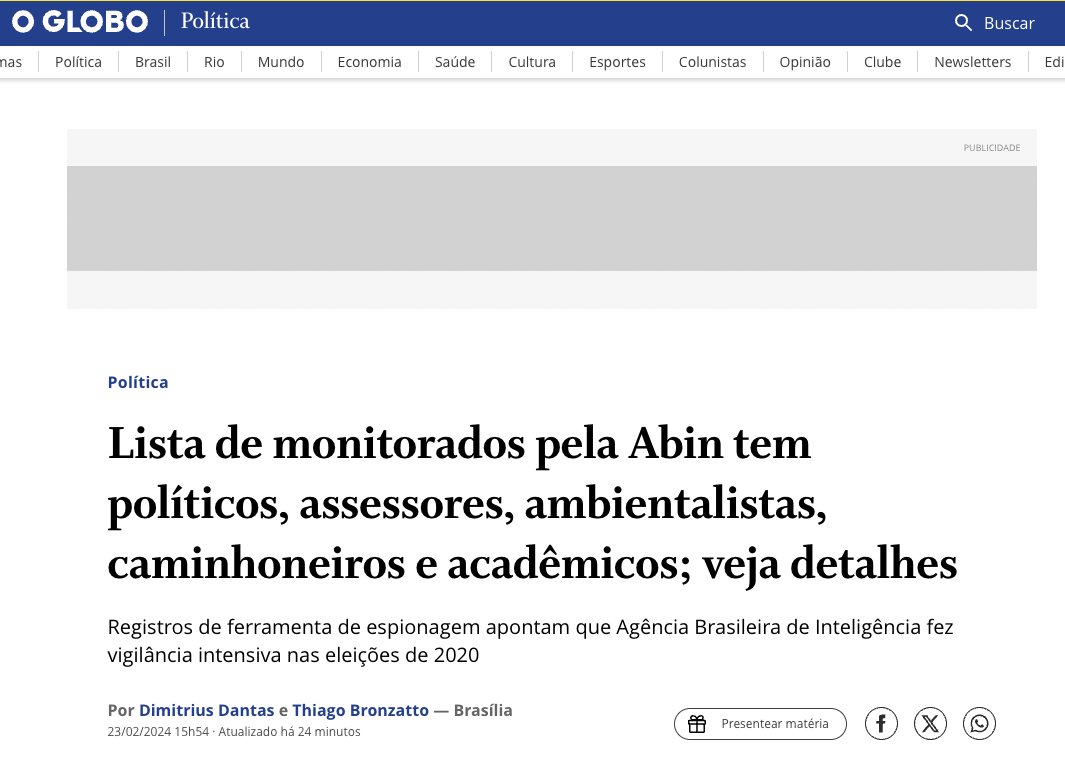 Hoje, uma reportagem revelou que em junho de 2019 – no auge da Vaza Jato – foi salvo num sistema da Abin o arquivo “pavão.pdf”. Ele continha prints de uma tela de pesquisas sobre os deputados Jean Willys, David Miranda e o jornalista Leandro Demori, que na época trabalhava no Intercept.
