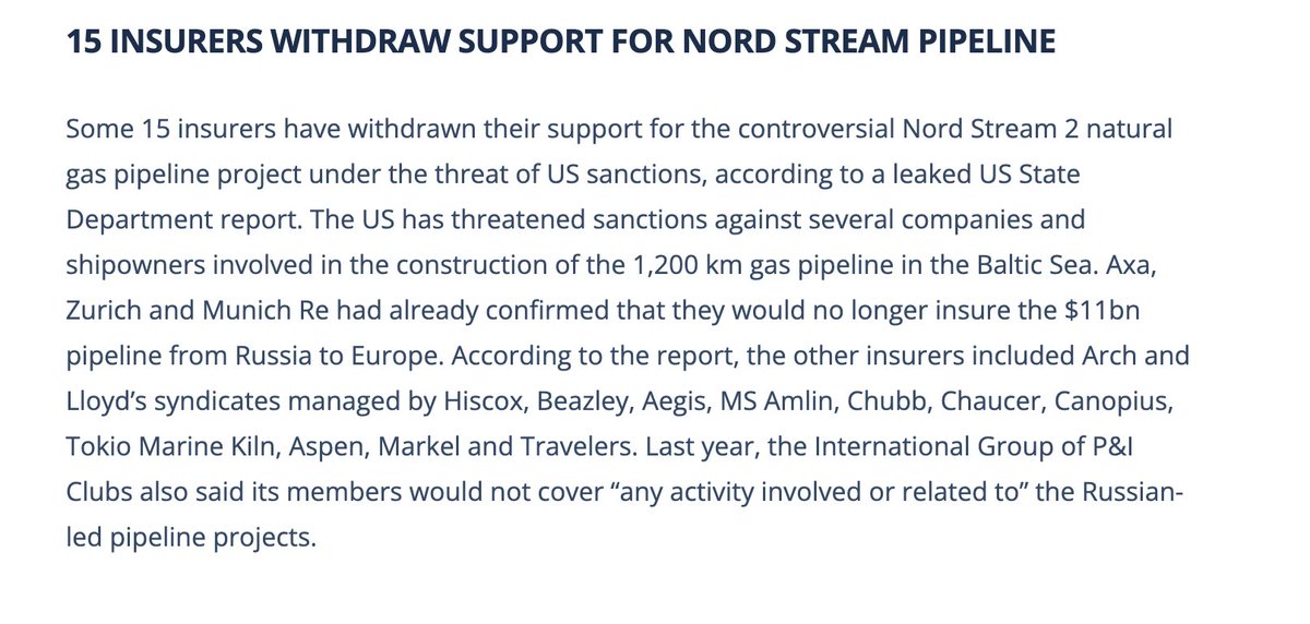Below is news from 2021 where companies Lloyds and Arch were listed among those who bailed out of insuring Nord Stream 2 because of sanctions. Nord Stream 1 was not affected by those sanctions, but apparently sanctions might work retroactively to the benefit of insurers. Hmmm.