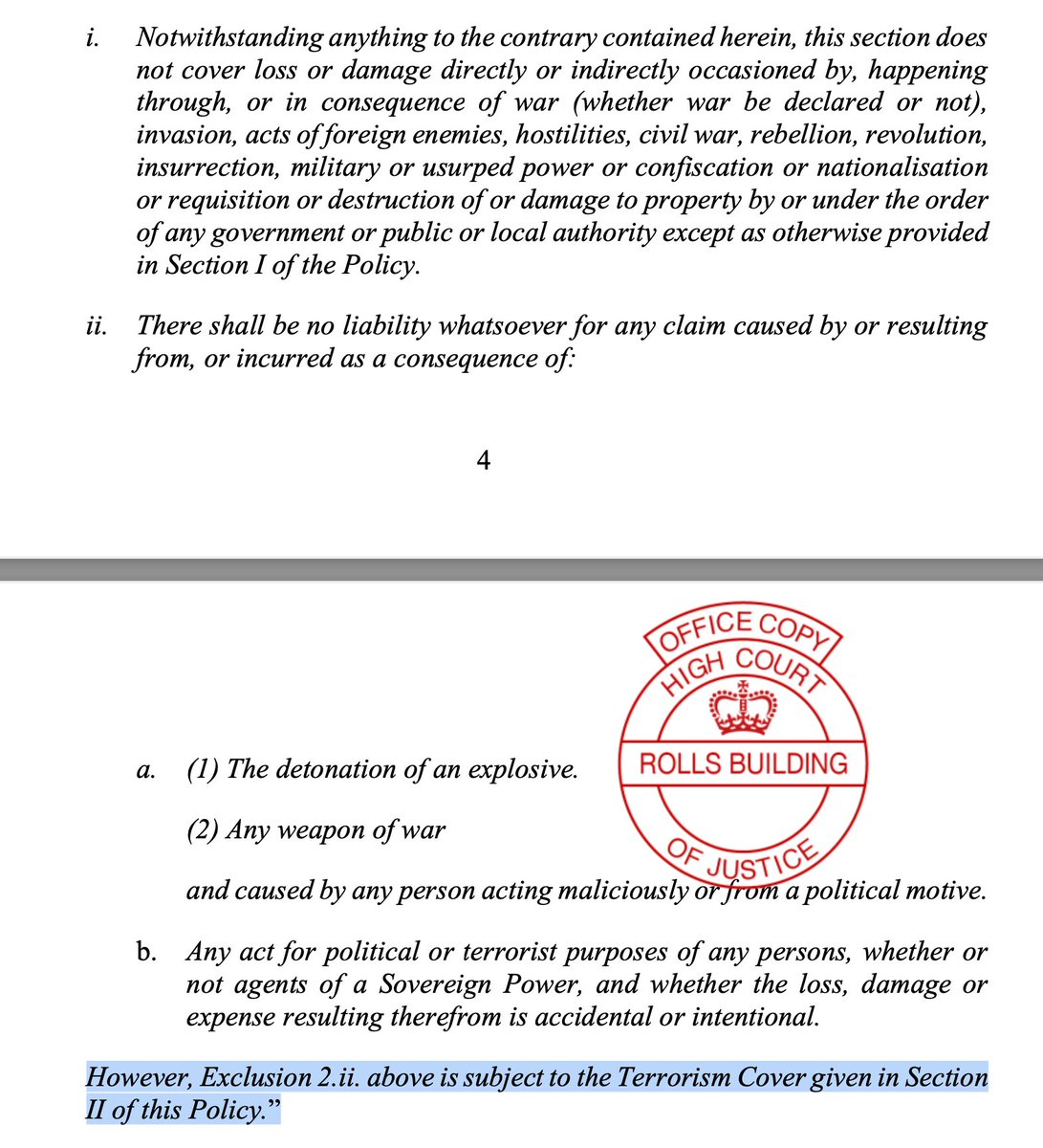 The full text of the insurance policy is not made public, but claimants and defendants are both quoting the excerpts they find relevant. Both parties agree that the "War&Terror" exclusion below and therefore "Section II" applies. But Sec II only covers "terror", not "war".