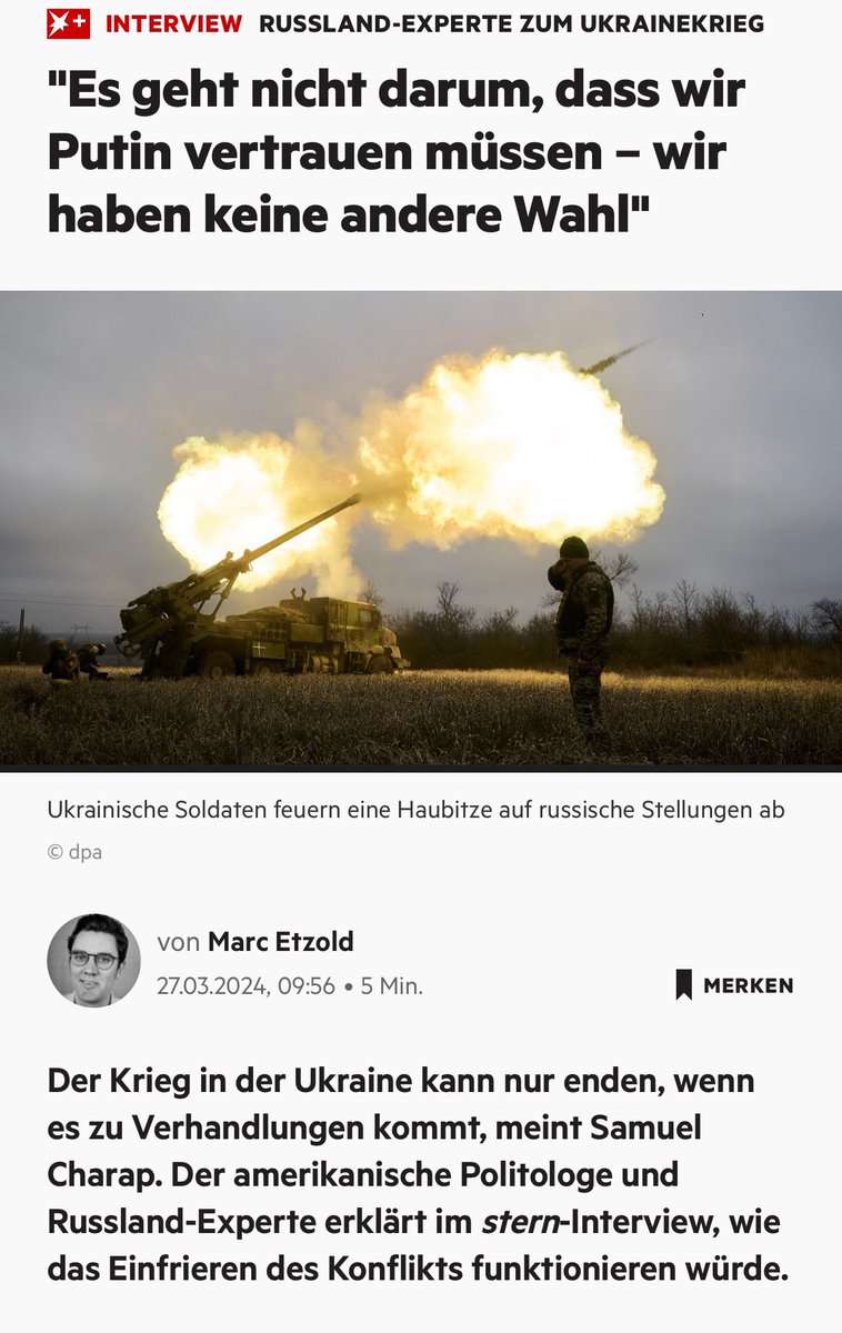 „An jenem Abend in der Residenz des Botschafters hingegen lobte der Kanzleramtschef ausdrücklich den Strategen Charap dafür, dass er Denkräume für einen Verhandlungsfrieden öffne“ und „Schmidt habe die Ideen Charaps euphorisch gelobt“