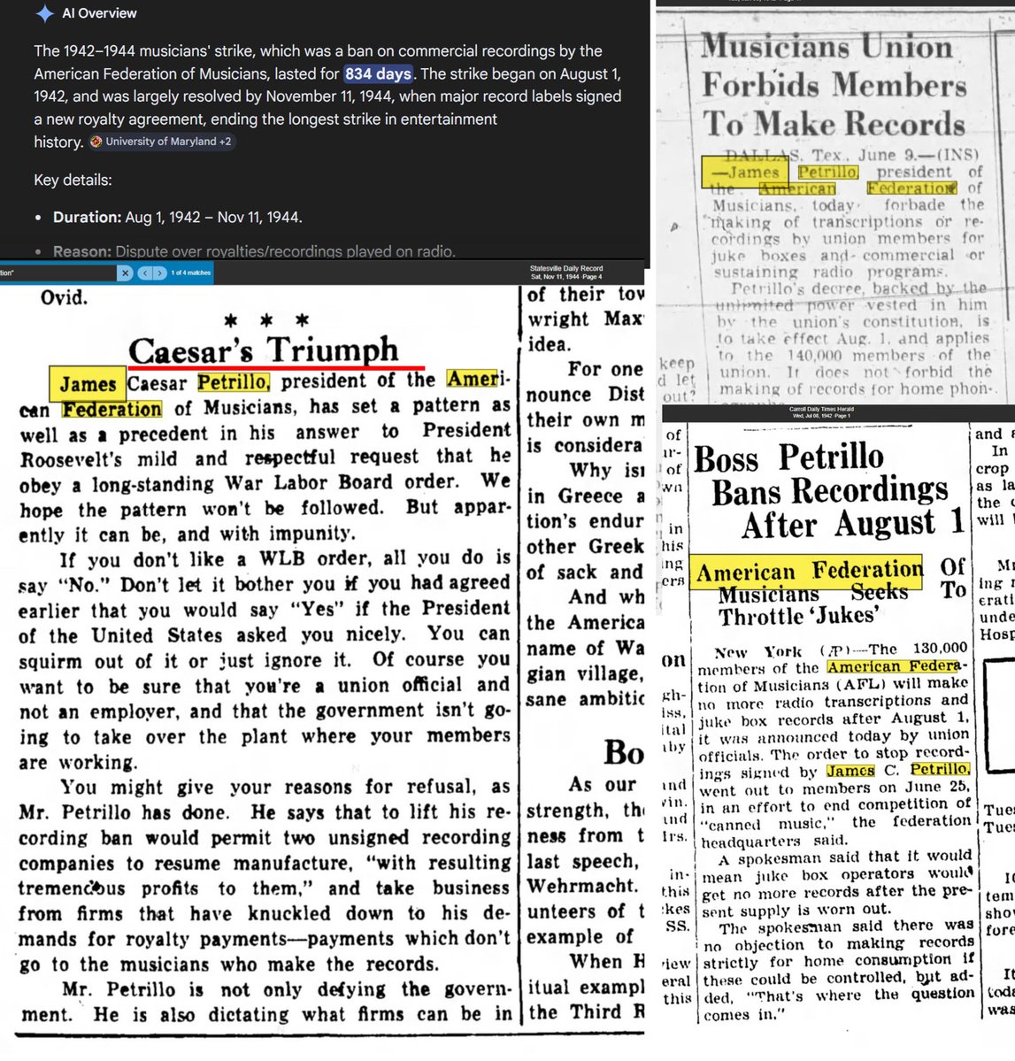 834 days 1942-1944 = Longest entertainment strike in history occurs during WW2 led by by James "Caesar" Petrillo.