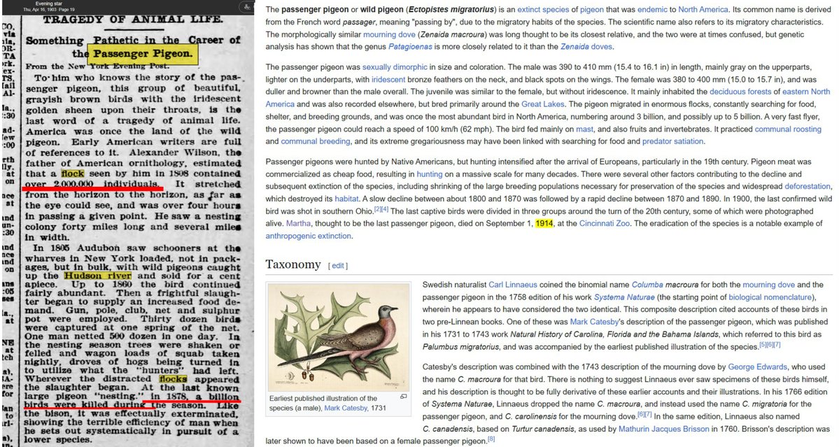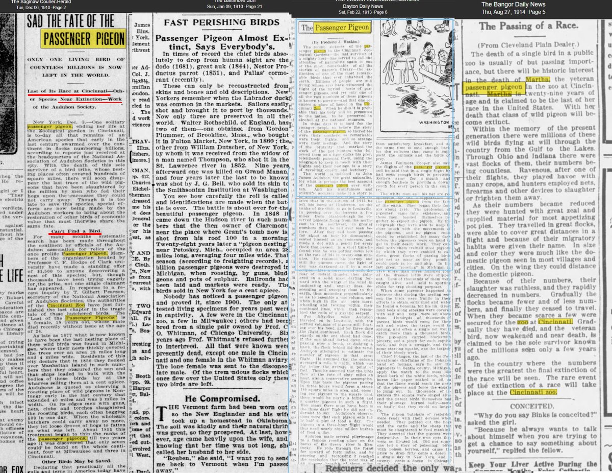One thing to note about that final passenger pigeon is that it was widely reported as a countdown to its extinction for years until it died in 1914.