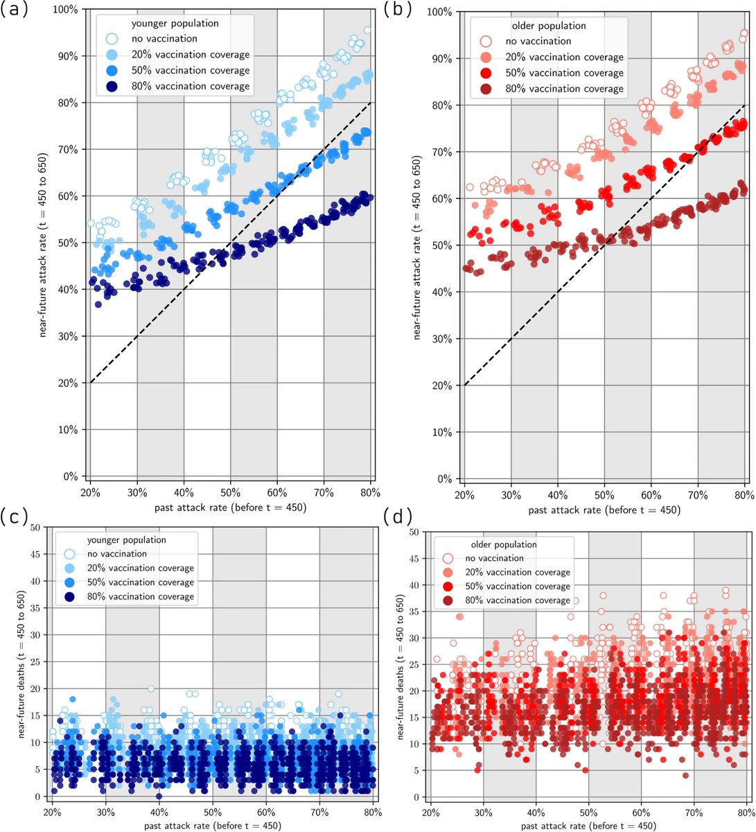 4) ...can delay and suppress future waves compared to low (20%) coverage, especially if past infection rates were also high (>50%).